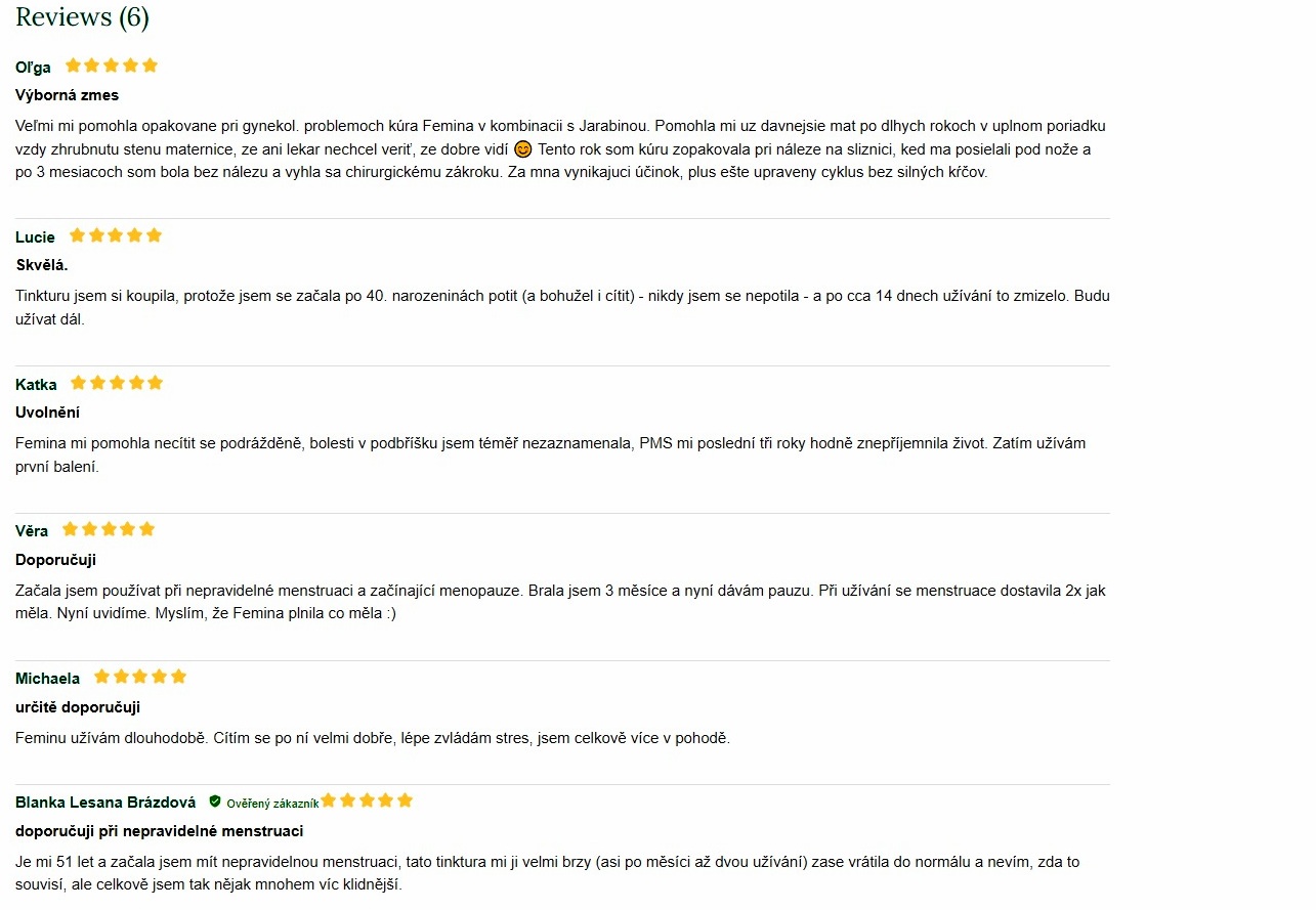 FEMINA - tinktura je směsí libečku, meduňky, hluchavky, měsíčku, šalvěje, kontryhele a třapatky. Udržování hormonální rovnováhy v ženském organismu, hladký průběh menstruačního cyklu, podpora sexuální potence, omezení průvodních příznaků menopauzy, optimální fyzická a psychická relaxace.