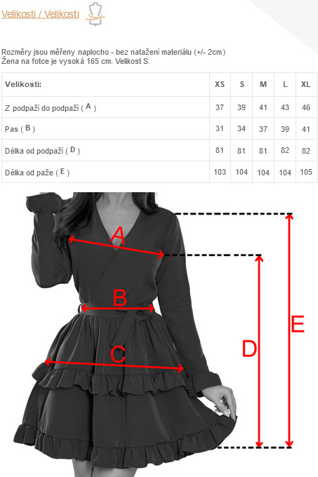 Modelka na obrázku je 165cm vysoká a má velikost S.| Rozměry (cm): | XS | S | M | L | XL |