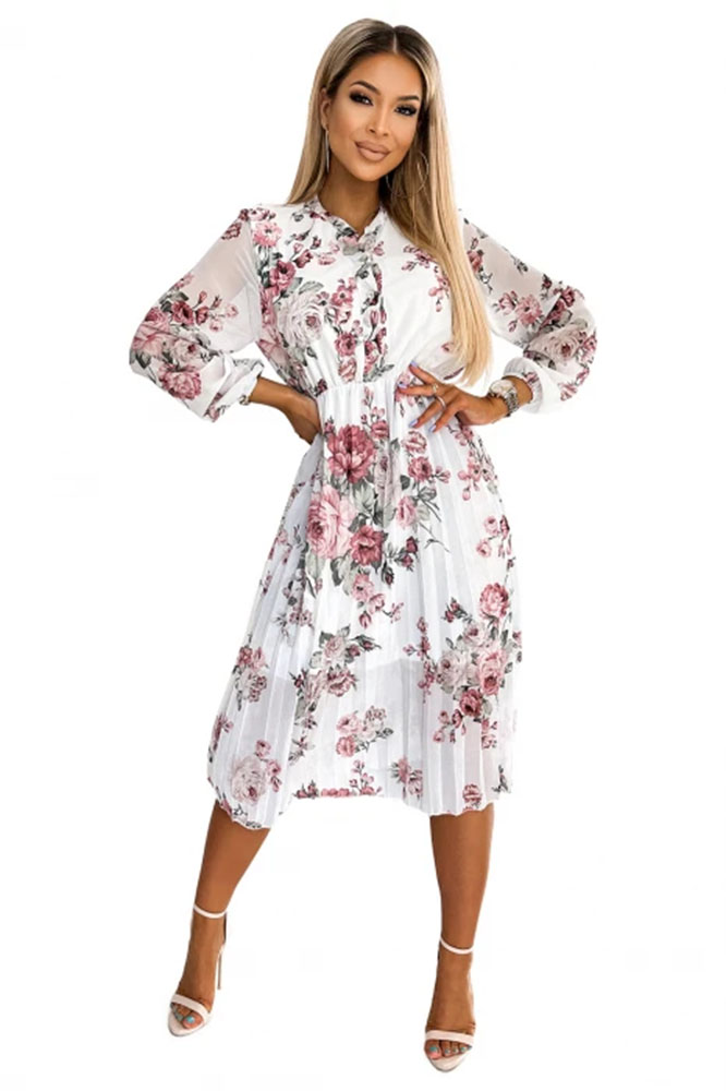 - Numoco 449-1 CARLA Plisované midi šaty na knoflíky a dlouhý rukáv - růže na bílém podkladu UNI