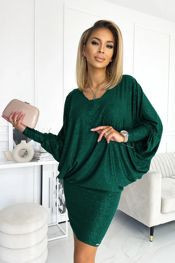 Klasické šaty v zelené barvě, které spojují volnost s elegancí. Volný horní díl typu netopýr jemně obepíná siluetu, zatímco přiléhavý spodní díl zvýrazňuje pas a linii boků. Toto je model, po kterém sáhnete bez váhání: hodí se do práce, na schůzku i na večerní akci.